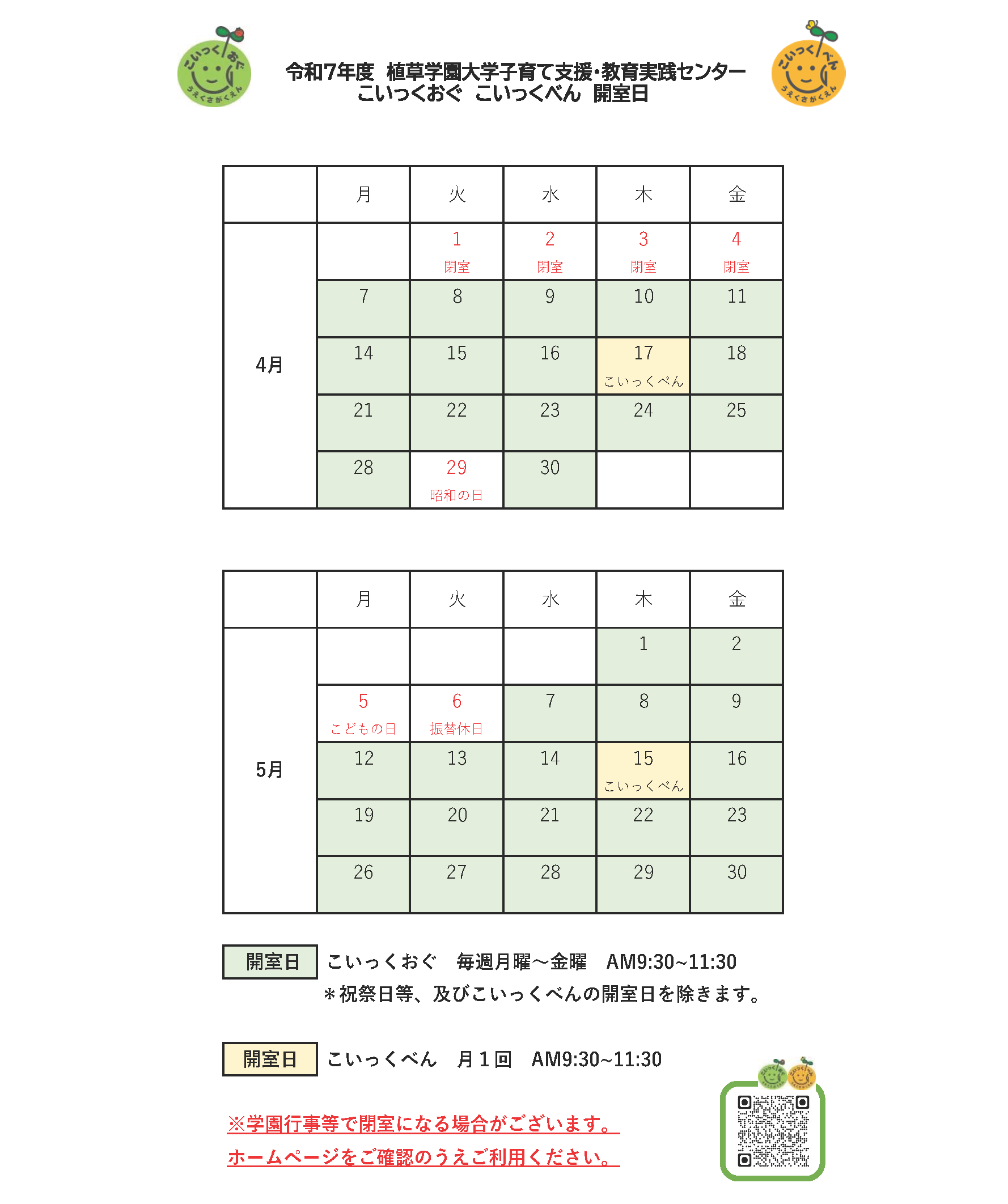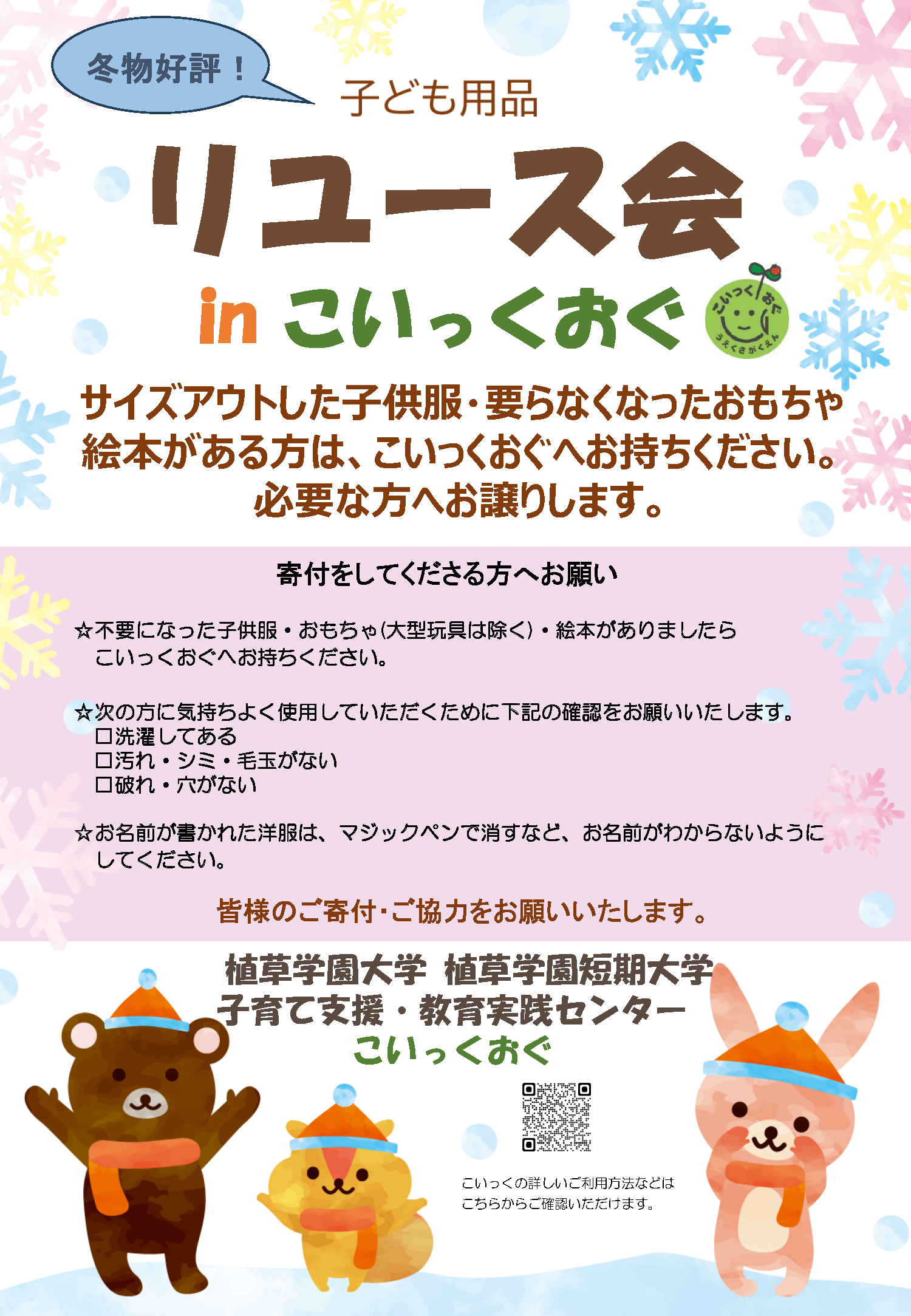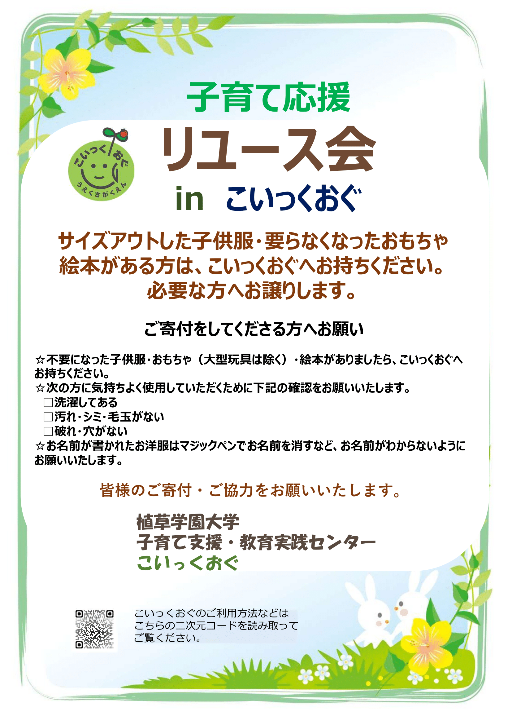 ~親子の子育てを支援します~ 愛称である 「こいっく」 には、保護者の心を育てることで育児不安をなくし、同時に子どもの心も育てたいという意味が込められています。 シンボルマークには、誰でも来やすく、植草らしさを表すものとして、学園のシンボルマークの 『U』 と 『G』 の文字を用いた、微笑んでいる人の顔と千葉若葉キャンパス内にある植草共生の森(ビオトープ)に集う虫たちが描かれています。