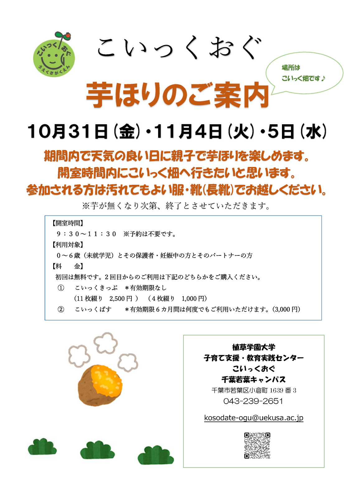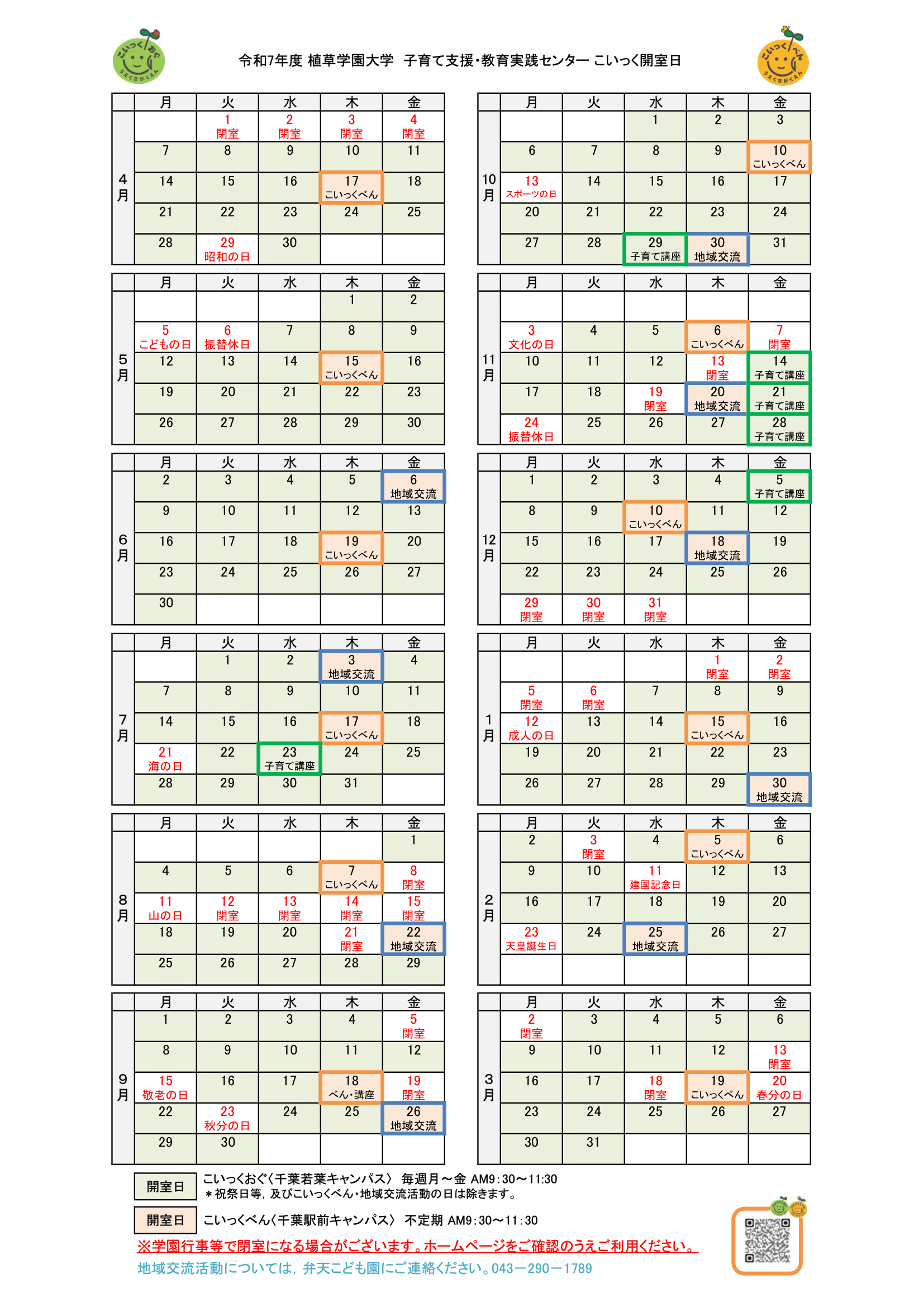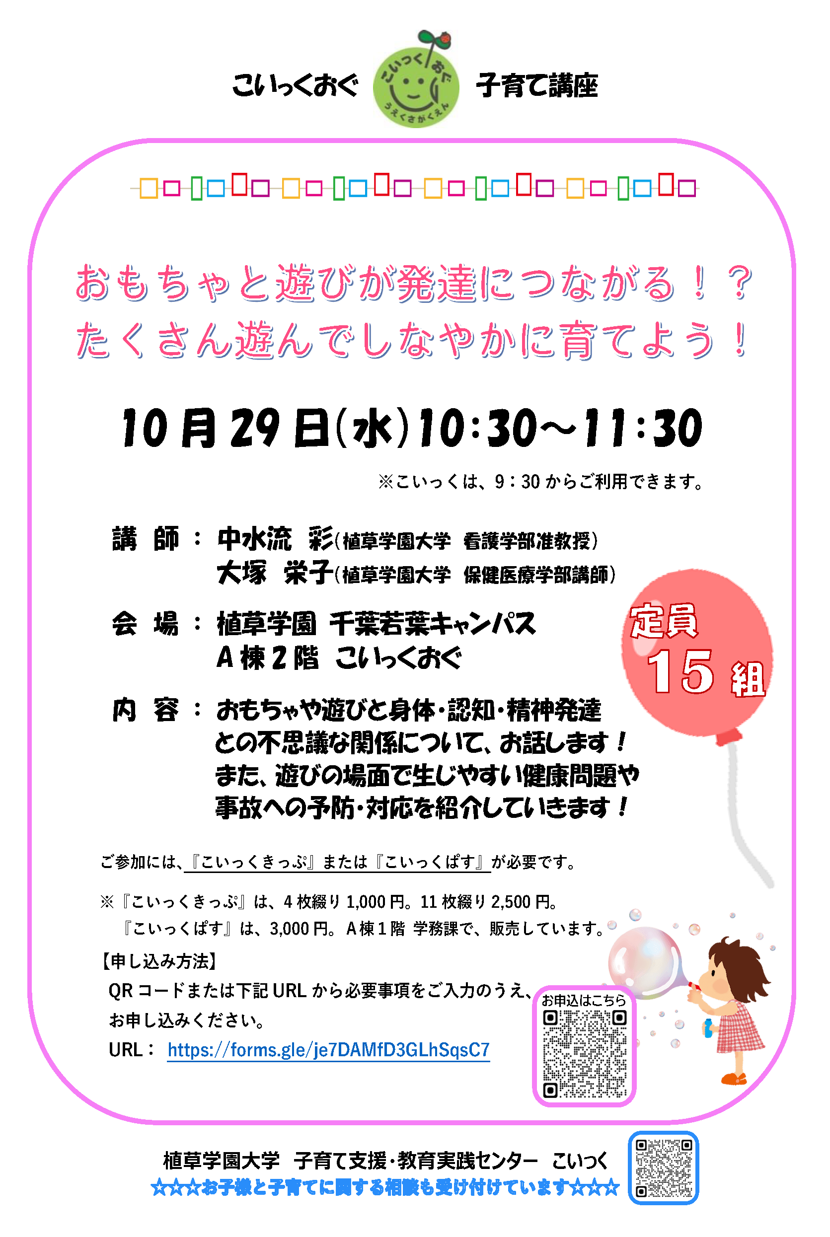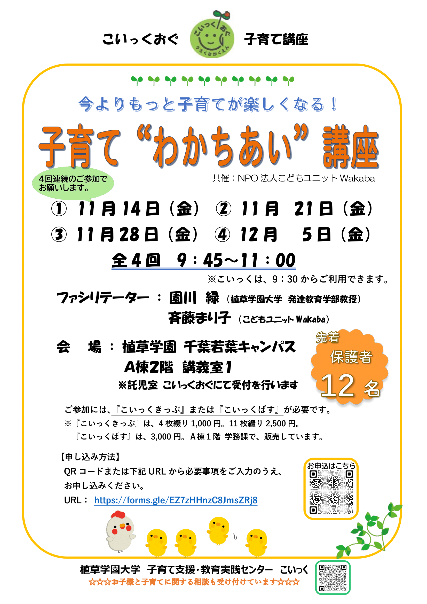~親子の子育てを支援します~ 愛称である 「こいっく」 には、保護者の心を育てることで育児不安をなくし、同時に子どもの心も育てたいという意味が込められています。 シンボルマークには、誰でも来やすく、植草らしさを表すものとして、学園のシンボルマークの 『U』 と 『G』 の文字を用いた、微笑んでいる人の顔と千葉若葉キャンパス内にある植草共生の森(ビオトープ)に集う虫たちが描かれています。