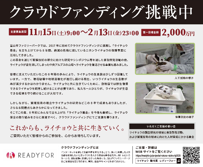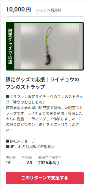 富山市ファミリーパークでは、「残そう、ライチョウ!動物園の次なる挑戦」というプロジェクトのクラウドファンディングを行っていますが、そこでこのストラップを活用してくれています。雷鳥や雷鳥の生息する自然がいつまでも残されていくために、少しでもお役に立てれば嬉しいです。