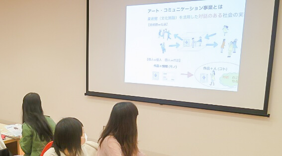 続いて都美術館に行き、Museum Start あいうえの 運営チーム(東京都美術館 × 東京藝術大学)担当の方から、アート・コミユニケータの活動と子どもたちとの関わり等のお話を伺いました。障害のある子どもも、ない子どもも同一プログラムで、一人の子どもに一人のアート・コミユニケータがつくことやお互いが学び合える鑑賞のあり方の実践、「よくみる」「よくきく」「よくかたる」という人々が安心して話せる環境や場を作る大切さ等、とても共感できる内容でした。こどものオーディオ・ガイドづくりの実際を動画で見せていただき、その後、美術館で「奇想の系譜展 江戸絵画ミラクルワールド」を鑑賞した際に、子どものオーディオ・ガイドづくりを踏まえて作品の鑑賞の仕方を保育に活かす方法はないか、自分ならどうこの絵を語るか等、すぐにお話から実際に試みる学生も複数いました。